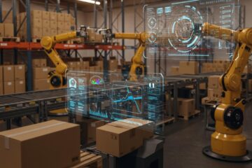 창고형 공간의 자동화 설비와 모니터링 화면들이 산업 운영 데이터를 시각적으로 보여주는 사례 묶음